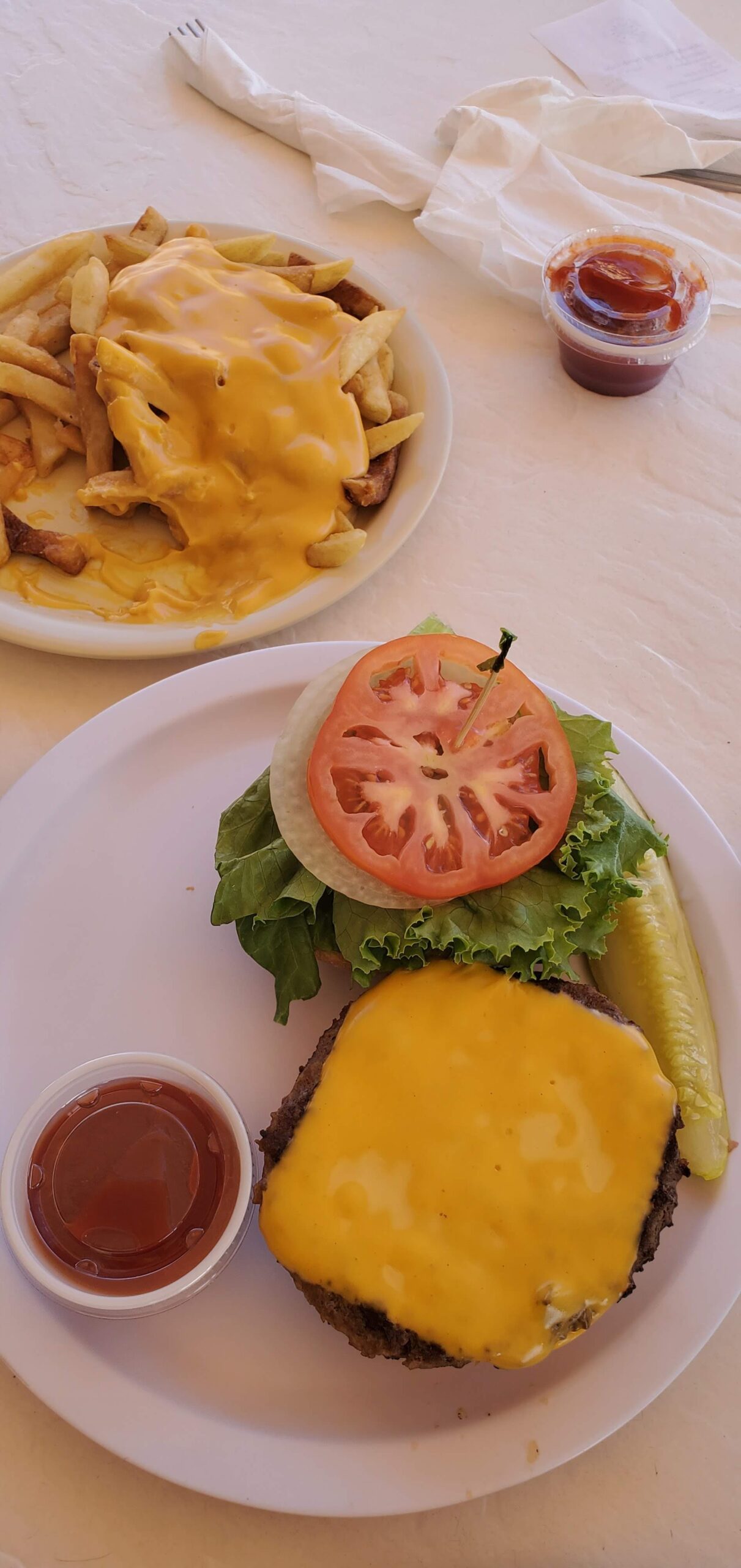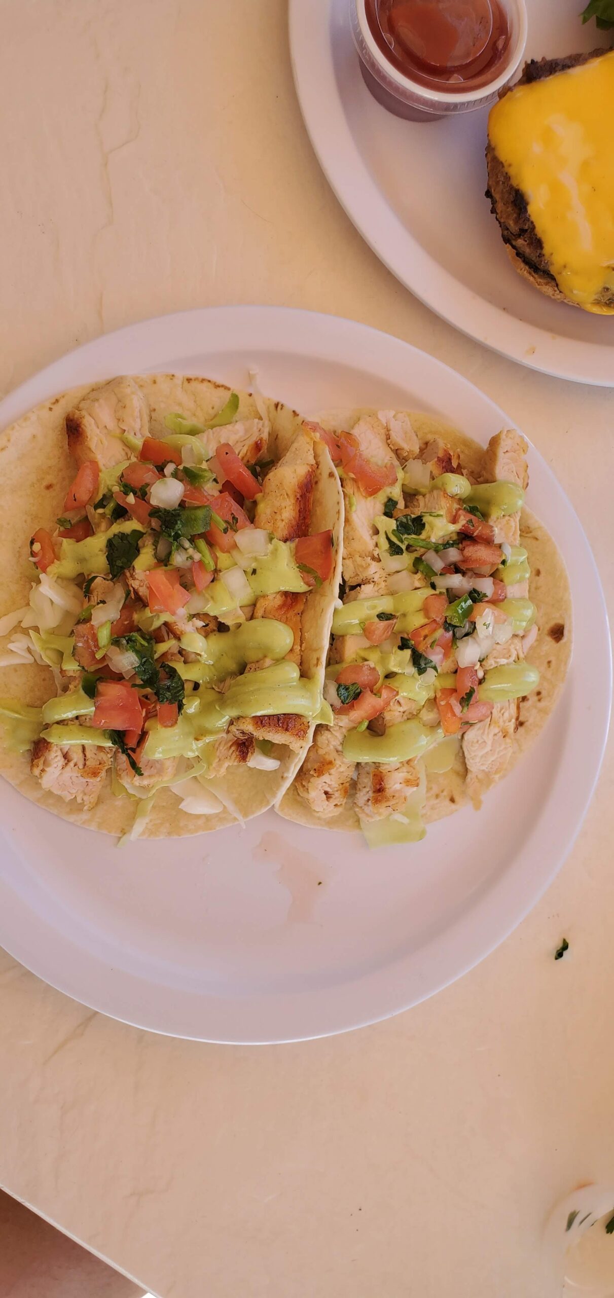 I had the chicken tacos, and hubby had a cheeseburger with cheese fries!